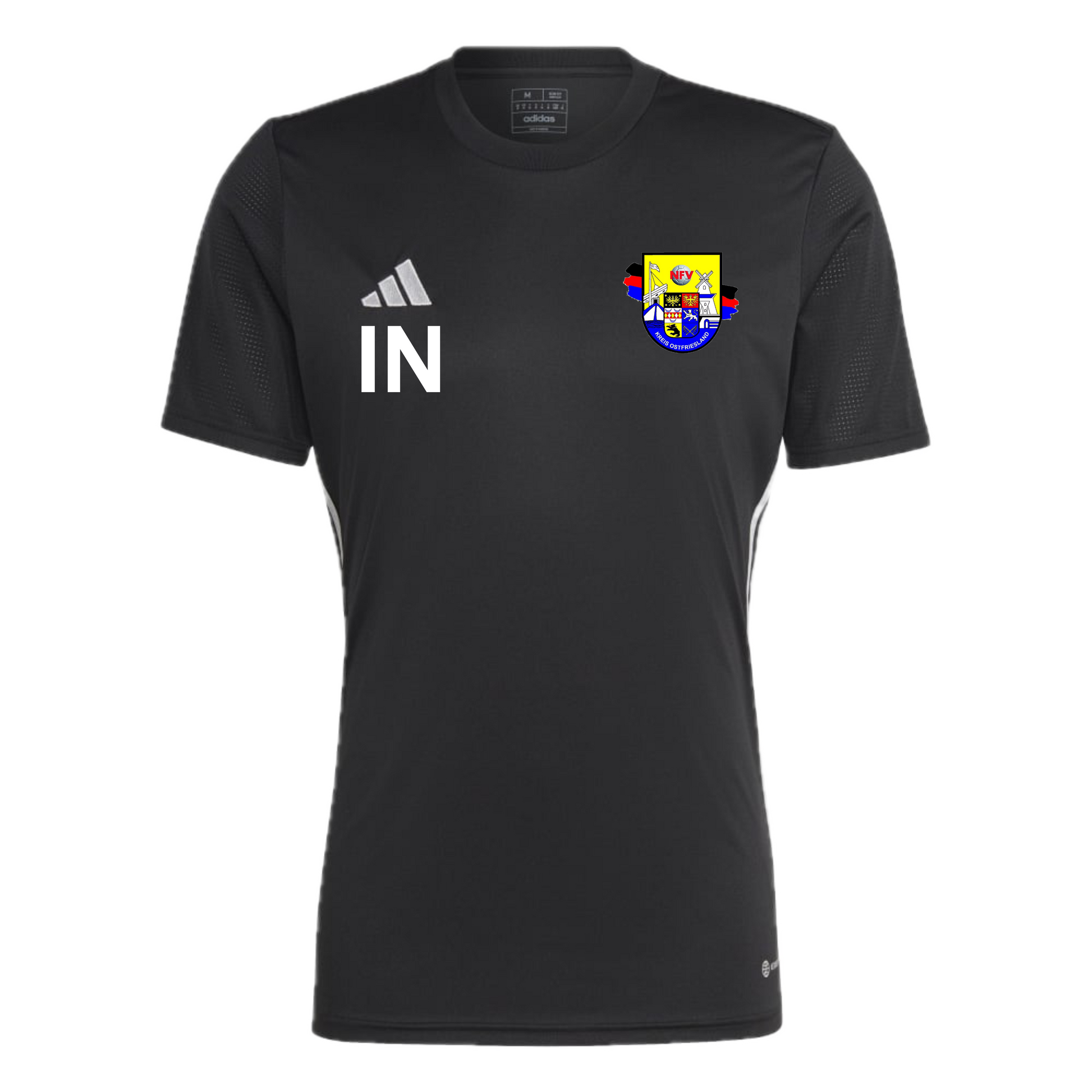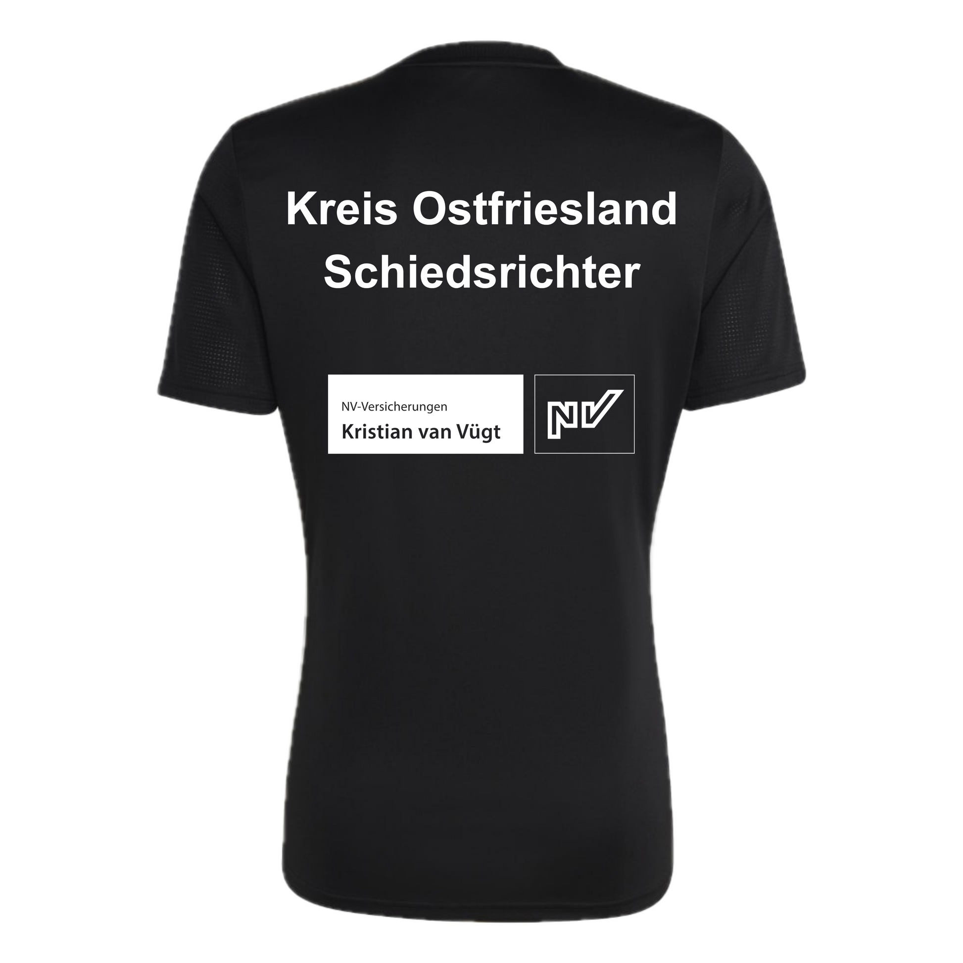 Schwarzes Aufwärmshirt von Adidas mit Logo des Kreises Ostfriesland und Rückenaufdruck „Schiedsrichter Kreis Ostfriesland“