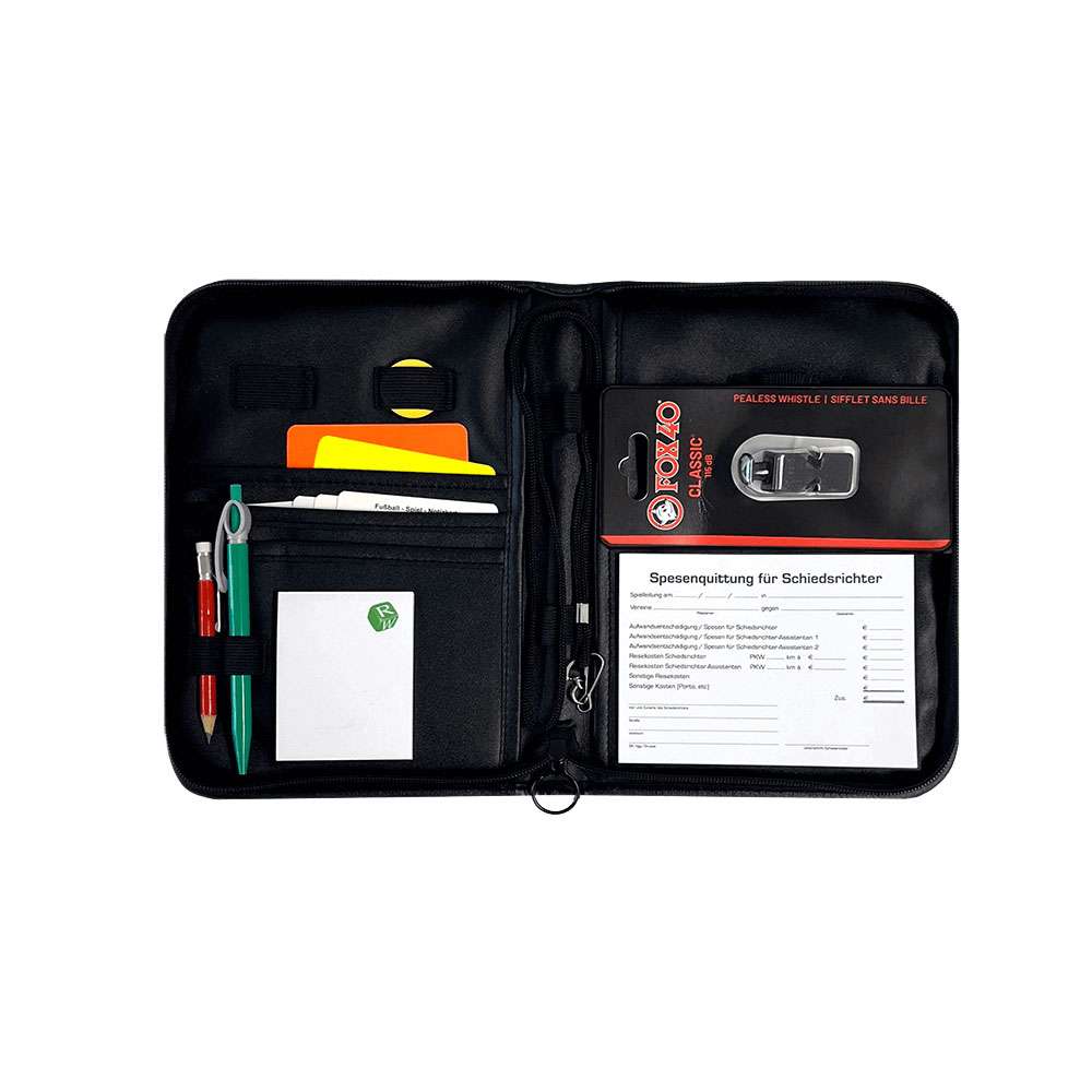 Diese hochwertige Schiedsrichtermappe ist der perfekte Begleiter für jeden Fußball-Schiedsrichter, der Wert auf eine professionelle Ausstattung legt. Sie enthält alles, was Sie auf dem Spielfeld benötigen, um Ihr Spiel effizient und souverän zu leiten. Maße: 27x18 cm geschlossen, 38x27 cm offen Inhalt der Schiedsrichtermappe: - Fox40 Pfeife: Der Klassiker unter den Schiedsrichterpfeifen. Eine zuverlässige, laute und langlebige Pfeife, die für klare und unmissverständliche Signale sorgt. - Rote und Gelbe Karte: Hochwertige gut sichtbare Karten zur deutlichen Kommunikation von Verwarnungen und Platzverweisen - 5 Spielnotizkarten: Robuste Karte zur Erfassung wichtiger Spielereignisse wie Tore, Auswechslungen, Verwarnungen, Platzverweise, etc. - Wählmarke: Praktisches Hilfsmittel für die Entscheidung beim Münzwurf zu Spielbeginn. - Pfeifenkette: Sichere und bequeme Befestigungsmöglichkeit für Ihre Pfeife, um sie jederzeit griffbereit zu haben. - Quittungsblock: Spielabrechnung einfach gemacht! Erfassung der Spesen und allen Aufwandspauschalen für Schiedsrichter und Assistenten. - Kugelschreiber und Bleistift: Zwei Schreibutensilien, um auf jeder Oberfläche präzise und zuverlässig zu schreiben. - Notizblock: Praktisches Hilfsmittel für schnelle Notizen Diese Schiedsrichtermappe ist kompakt, handlich und aus strapazierfähigem Material gefertigt. Sie bietet Platz für alle wichtigen Utensilien und lässt sich einfach verstauen. Ob Amateur- oder Profispiel – mit dieser Schiedsrichtermappe sind Sie für jede Spielleitung bestens gerüstet.